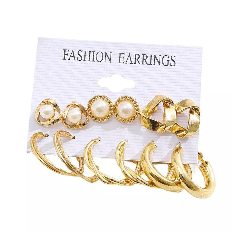 Gold Plated Contemporary Studs and Hoop Earrings Set of 6 For Women