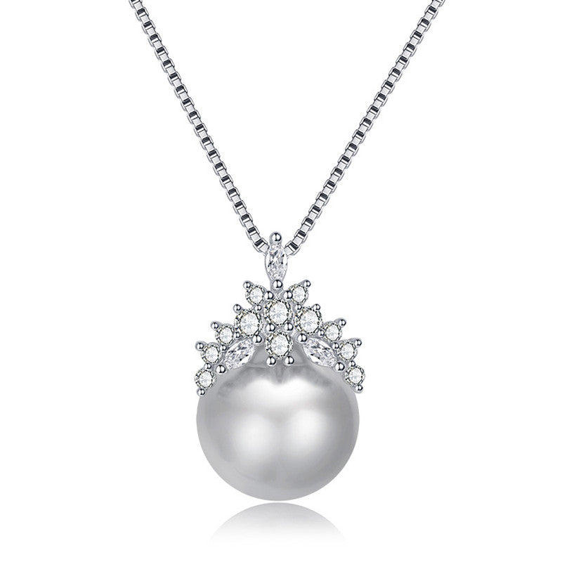 Silver Plated American Diamond Studded Crown Like Pearl Studded Korean Pendant